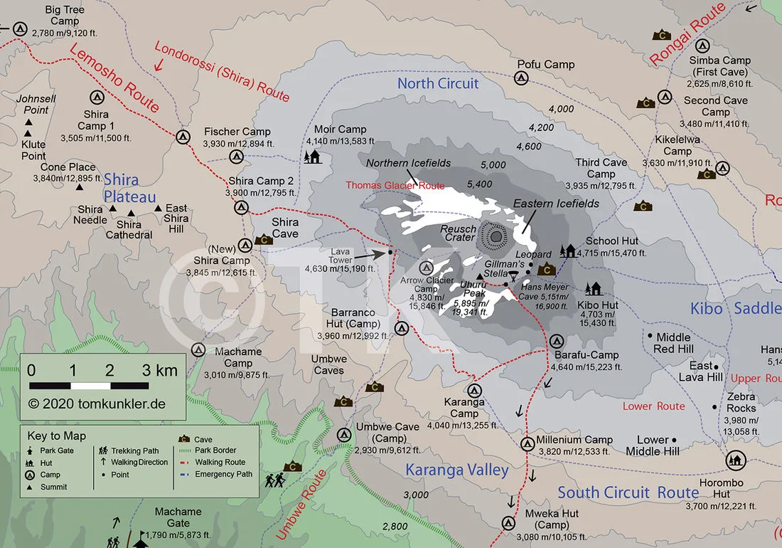 Having acclimatised on Meru, your Kilimanjaro hike begins on the Shira Plateau where you will be rewarded with your first up-close view of Kibo, the daunting but surmountable summit cone. Follow the Lemosho route, tracking around the south of the mountain, climbing over ridges, passing the impressive Lava Tower and scrambling the imposing Barranco Wall. These trekking days give you further opportunity to acclimatise, as you climb higher during the day but lose height to camp, and allowing you two easier days before tackling the long summit climb, which gives you a very strong chance of reaching your second summit of the trip!